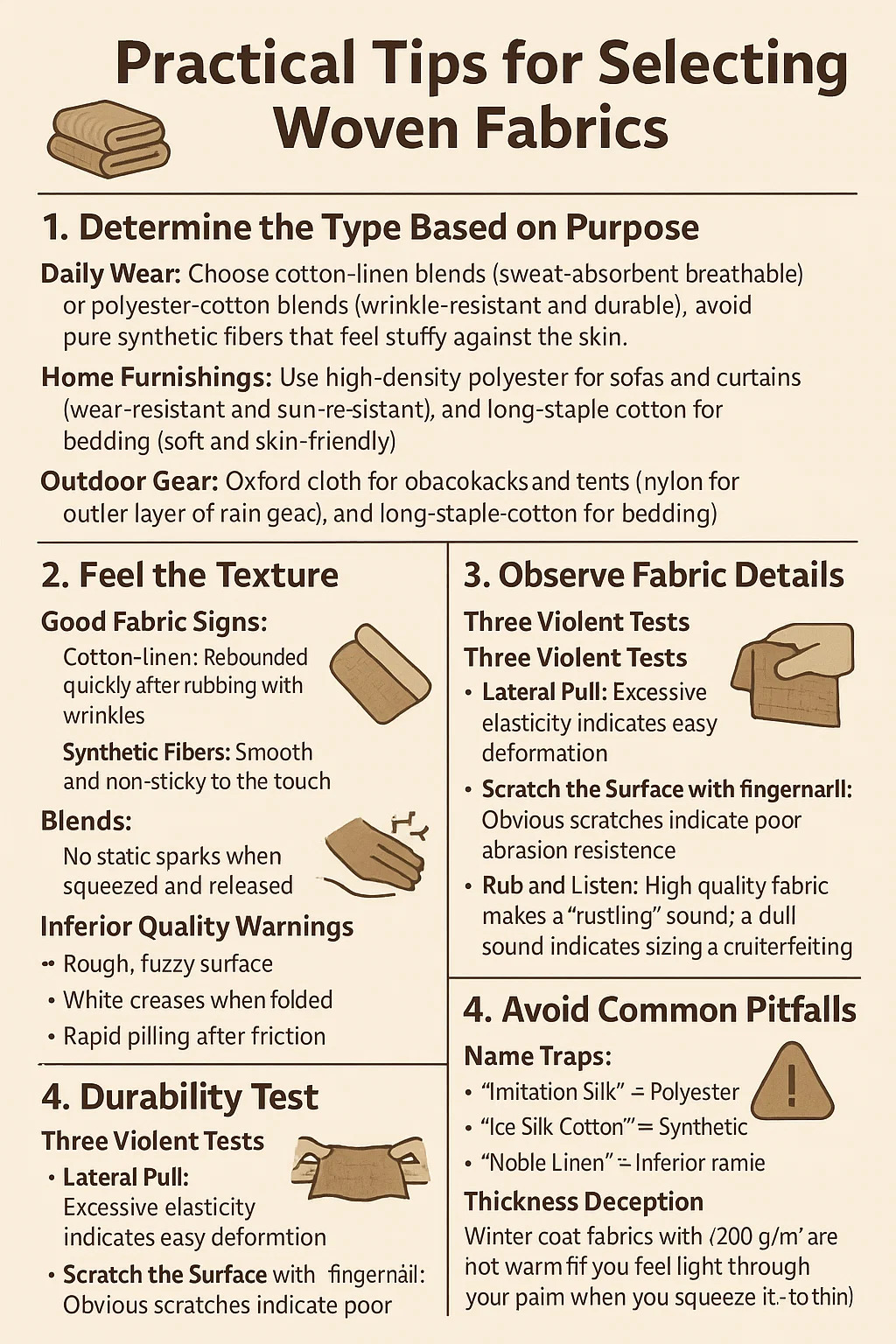 Jasnost textury: Prohlédněte si osnovní a útkové nitě proti světlu – vysoce kvalitní látky mají úhledné, šachovnicové vzory, zatímco méně kvalitní látky mají přerušené nitě nebo nerovnoměrnou hustotu.