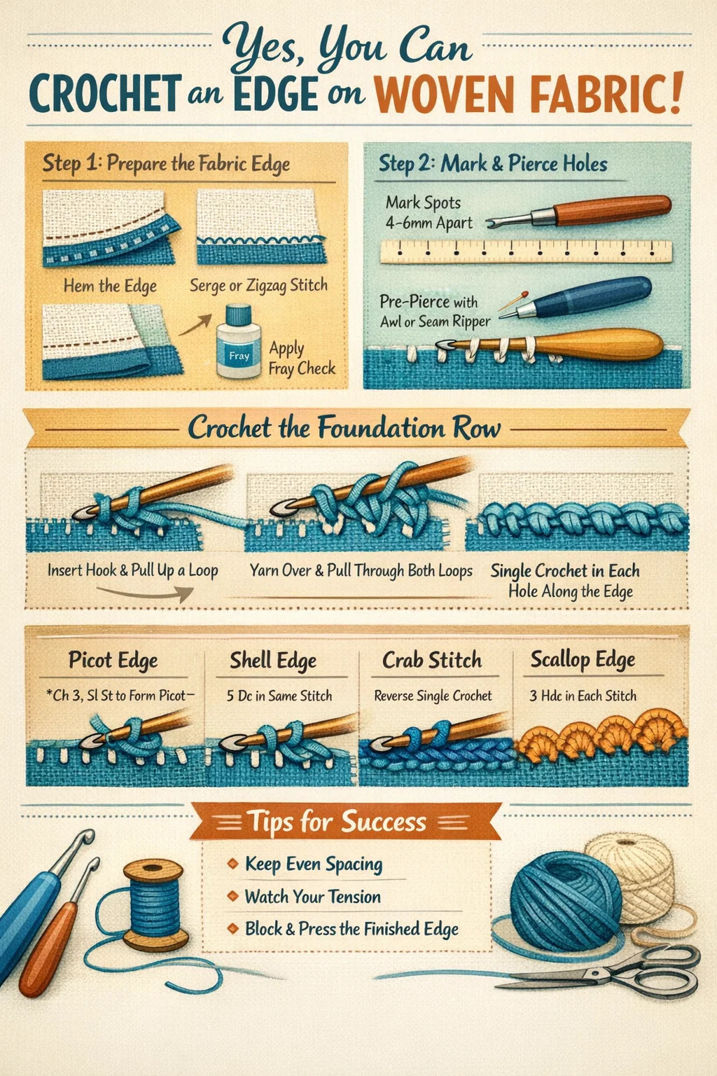 Háčkování okraje na tkaná látka je zcela možné a vytváří leštěný, dekorativní povrch, který také zabraňuje třepení. Základem je správná příprava látky pomocí správné velikosti háčku a vytvoření základní řady jednotlivých háčkovaných stehů rovnoměrně podél okraje, než na ni postavíte jakýkoli ozdobný vzor. Většina řemeslníků zjistí, že a Americká velikost D/3 (3,25 mm) až F/5 (3,75 mm) háček na háčkování funguje dobře pro středně těžké tkané látky, i když byste měli vždy nejprve vyzkoušet na kusu odpadu.
