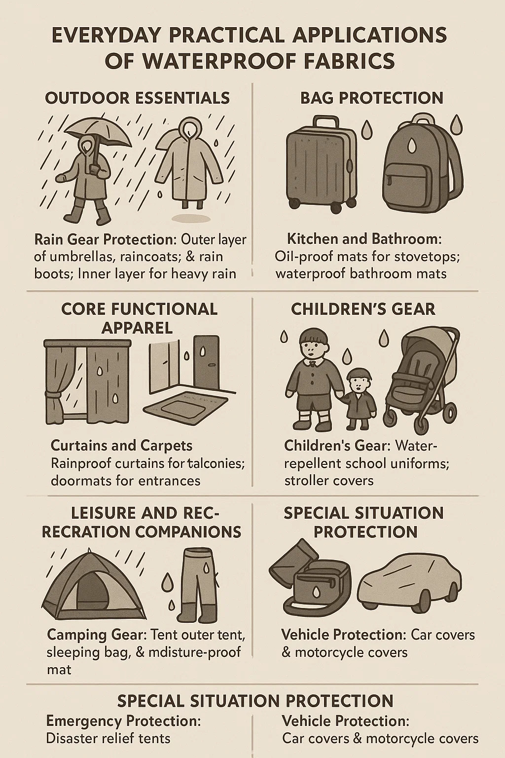 Dětské vybavení: Vodoodpudivé školní uniformy; kryty na kočárky; chraňte děti před náhlým deštěm a udržujte je v teple.