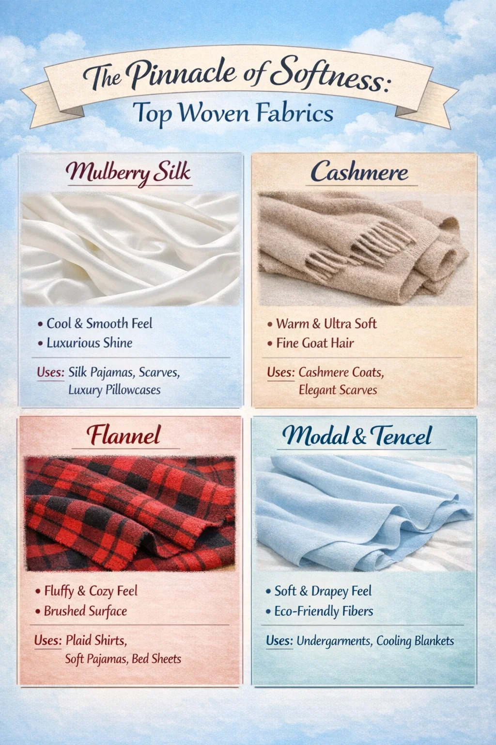 Pokud jde o "nejjemnější" tkané látky , opravdu záleží na druhu pocitu, který hledáte – ať už je to nadýchanost podobná mrakům nebo hedvábná hladkost.
